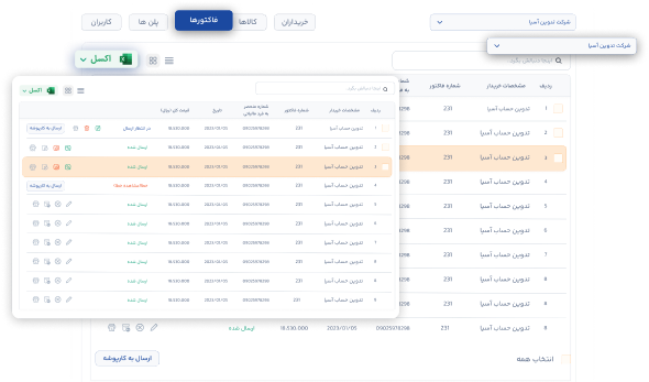در تب مدیریت فاکتورها می توانید فاکتورهای مربوط به فروش محصولات خود را اصلاح، ابطال، برگشت از فروش، ویرایش و پرینت کنید. همچنین می توانید بر اساس بازه زمانی مشخص، فاکتورها را فیلتر کرده و از آنها خروجی اکسل بگیرید و یا برعکس از اکسل، فاکتورهای خود را وارد کنید.